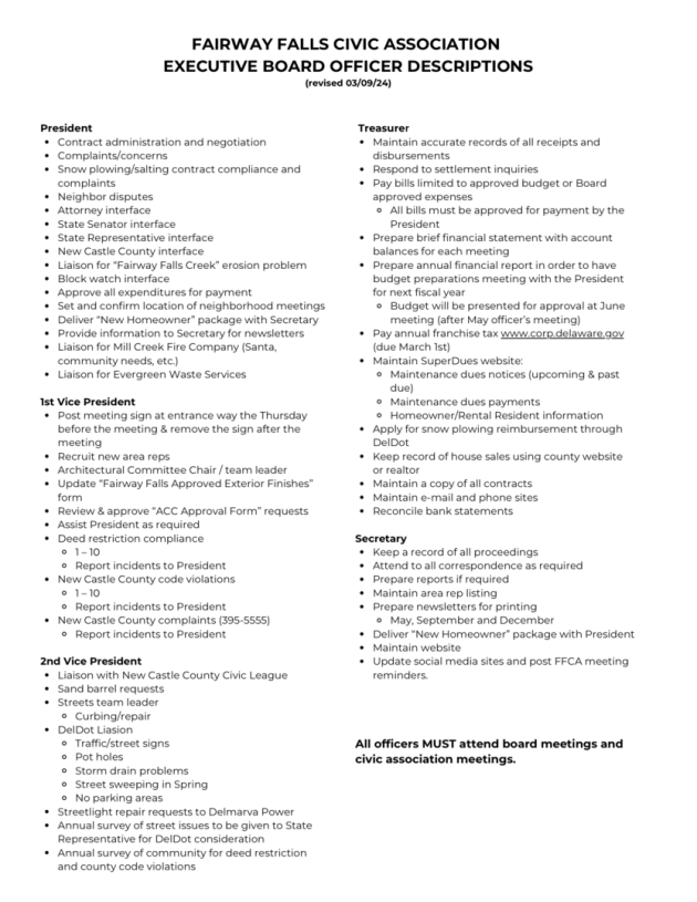 Get to know your Board Members. Our Board Members volunteer their time to help keep the community running smoothly. We are always open to new ideas to make the community better. You can reach us at our Community Hotline and Community Email listed on our Contact Us page.